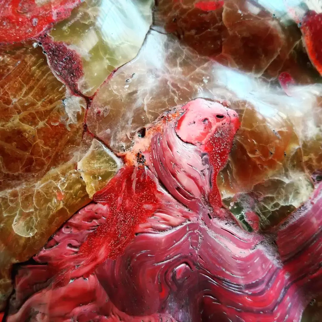 Par différents degrés de fusion du plastique recyclé, la pièce contient des jeux de textures très diversifiés, reprenant tour à tour les teintes de la lave, du quartz, de la cendre, mais également celle de la chaire des muscles et des vaisseaux sanguins.