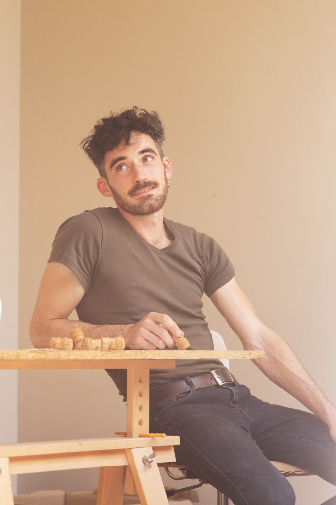 L’artisan a assemblé des bouchons de liège et de la poudre de liège broyée sur un plateau créé par moulage, qu’il a ensuite poncé à la main avec du papier abrasif, puis poli à l’eau.